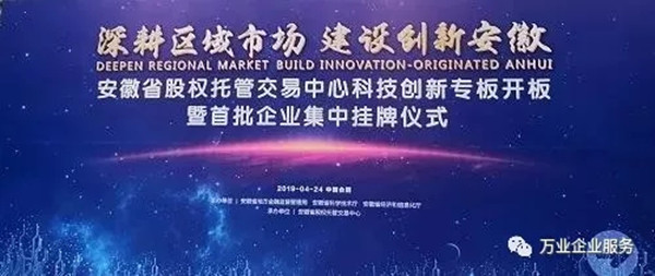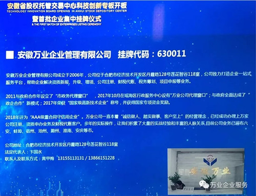 熱烈祝賀安徽萬業(yè)企業(yè)管理有限公司入駐 安徽省股交中心首批科創(chuàng)板企業(yè)?。?! 當(dāng)前,世界范圍內(nèi)正在孕育新一輪科技革命和產(chǎn)業(yè)變革,全球化競爭呈現(xiàn)出新的發(fā)展態(tài)勢,主要發(fā)達(dá)國家和創(chuàng)新型國家相繼出臺重大舉措,加快推動產(chǎn)業(yè)科技創(chuàng)新。 政策支持 2019年4月24日安徽《聚焦高新產(chǎn)業(yè)“硬科技”打造上市融資“孵化器”》安徽首批787家皖企掛牌科創(chuàng)專板在合肥濱湖新區(qū)圣盛大開板。省財(cái)政對在省股權(quán)托管交易中心科創(chuàng)板掛牌企業(yè)給予一次性獎補(bǔ)10萬元,完成改革并掛牌的再獎補(bǔ)10萬元,2年內(nèi)一共拿出3.3個億對企業(yè)實(shí)施獎補(bǔ),并鼓勵市、縣配套定制獎補(bǔ)政策。 “科創(chuàng)板”介紹 科創(chuàng)板是由國家主席習(xí)近平于2018年11月5日在首屆中國國際進(jìn)口博覽會開幕式上宣布設(shè)立,是獨(dú)立于現(xiàn)有主板市場的新設(shè)板塊,并在該板塊內(nèi)進(jìn)行注冊制試點(diǎn)。 萬業(yè)公司簡介 安徽萬業(yè)企業(yè)管理有限公司成立于2006年。萬業(yè)公司一直本著“誠信做人、踏實(shí)做事、客戶至上”的經(jīng)營理念,已經(jīng)成功辦理上萬家公司注冊、資質(zhì)申辦業(yè)務(wù)及財(cái)稅代賬客戶上千家。多年的實(shí)際操作,讓我們積累了大量的實(shí)戰(zhàn)經(jīng)驗(yàn)和豐富的人脈關(guān)系,公司擁有一批精通建筑業(yè)資質(zhì)申報知識、精通工商稅務(wù)行業(yè)及項(xiàng)目申報等專業(yè)精英。 安徽萬業(yè)掛牌 2019年4月24日這一天,安徽萬業(yè)企業(yè)管理有限公司成功入駐安徽省股交中心首批科創(chuàng)板企業(yè),掛牌證券代碼:630011,這是值得被紀(jì)念的一天,是一個新的歷史上的里程碑! 愿景 萬業(yè)公司將站在一個更高的平臺與殊譽(yù),致力于做好企業(yè)一站式服務(wù)平臺——所有平臺內(nèi)的業(yè)務(wù)將“一對一”客服經(jīng)理專業(yè)對接,一直追求與客戶建立長期穩(wěn)定的合作伙伴關(guān)系,為客戶提供熱誠、快捷、周到的服務(wù)! 企業(yè)一站式服務(wù)平臺 長按,識別二維碼,加關(guān)注 工商注冊、財(cái)稅代賬、審計(jì)評估、財(cái)務(wù)咨詢、商標(biāo)專利、資質(zhì)審批、人才獵頭、人才報名、金融保險、信用評級、法務(wù)咨詢、項(xiàng)目申報 公司網(wǎng)站:woodplate.cn 聯(lián)系方式:400-0551-976 合肥總部:安徽省合肥市南一環(huán)與馬鞍山路交口恒興廣場A座24樓 分部:合肥市行政服務(wù)中心一樓“萬業(yè)公司代理窗口”(工商局窗口正對面) 分部:合肥市瑤海區(qū)行政服務(wù)中心一樓“萬業(yè)公司代理窗口”(工商局窗口正對面) 蕪湖分部:蕪湖市鏡湖區(qū)偉星時代金融中心610室 (申經(jīng)理:189-0560-8966)