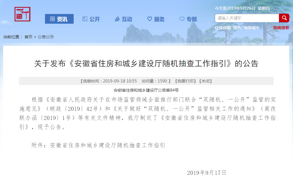 關(guān)于發(fā)布《安徽省住房和城鄉(xiāng)建設(shè)廳隨機(jī)抽查工作指引》的公告
