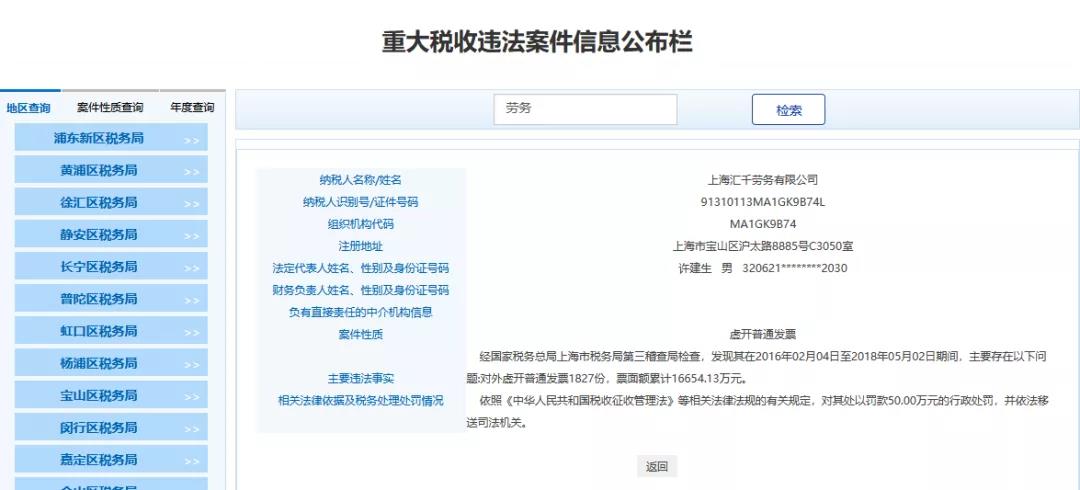 最近魔都上海傳來大消息,多家勞務公司和人力公司被查,清一色的罰款+移送司法機關,不難看出勞務公司一直是稽查重點,也是虛開的重災區(qū),一查一個準!