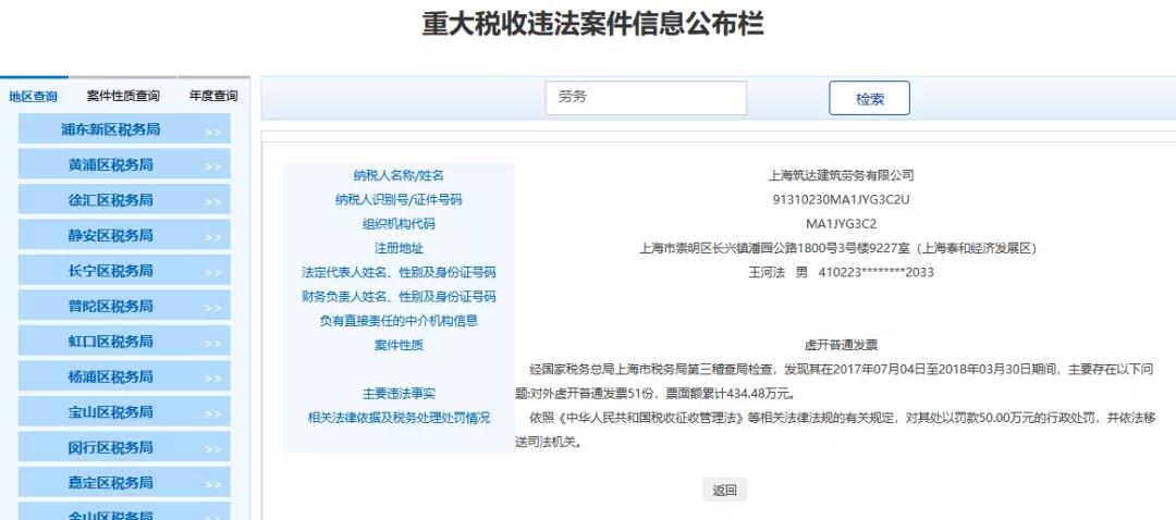 2、上海XX建筑勞務有限公司,經國家稅務總局上海市稅務局第三稽查局檢查,發(fā)現其在20170704日至20180330日期間,主要存在以下問題:對外虛開普通發(fā)票51份,票面額累計434.48萬元。依照《中華人民共和國稅收征收管理法》等相關法律法規(guī)的有關規(guī)定,對其處以罰款50.00萬元的行政處罰,并依法移送司法機關。