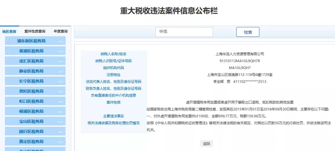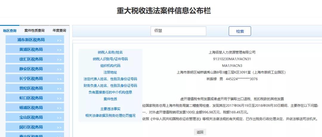5、上海XX人力資源管理有限公司,經國家稅務總局上海市稅務局第二稽查局檢查,發(fā)現其在20170619日至20180930日期間,主要存在以下問題:對外虛開增值稅銷項發(fā)票100,金額996.98萬元,稅額169.49萬元。依照《中華人民共和國稅收征收管理法》等相關法律法規(guī)的有關規(guī)定,已作出稅務行政處理決定,并依法移送司法機關。