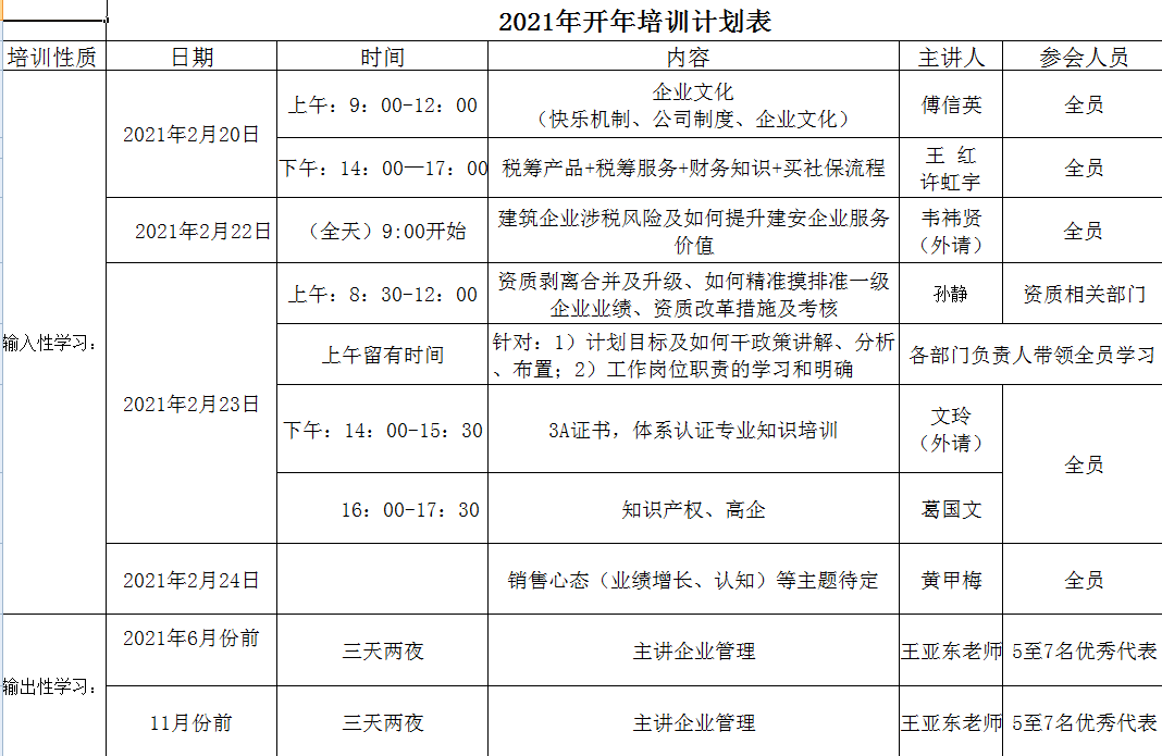 新年伊始,萬象更新,鞭炮映日,開工起航!為迎新年新氣象,賦能打好第一槍,2月20日安徽萬業(yè)2021年開年培訓(xùn)正式開啟,培訓(xùn)從2月20日9:00起至2月23日18:00,為期三天!開年培訓(xùn)是萬業(yè)的傳統(tǒng),全員參加,大家一起汲取知識和能量,為新一年的戰(zhàn)斗積蓄能量!萬業(yè)的家人們在公司集中學(xué)習(xí),通過公司內(nèi)部員工、外請老師、黃總等主持講課,讓大家接受了這場開年培訓(xùn)的潤澤。新年伊始,萬象更新,鞭炮映日,開工起航!為迎新年新氣象,賦能打好第一槍,2月20日安徽萬業(yè)2021年開年培訓(xùn)正式開啟,培訓(xùn)從2月20日9:00起至2月23日18:00,為期三天!