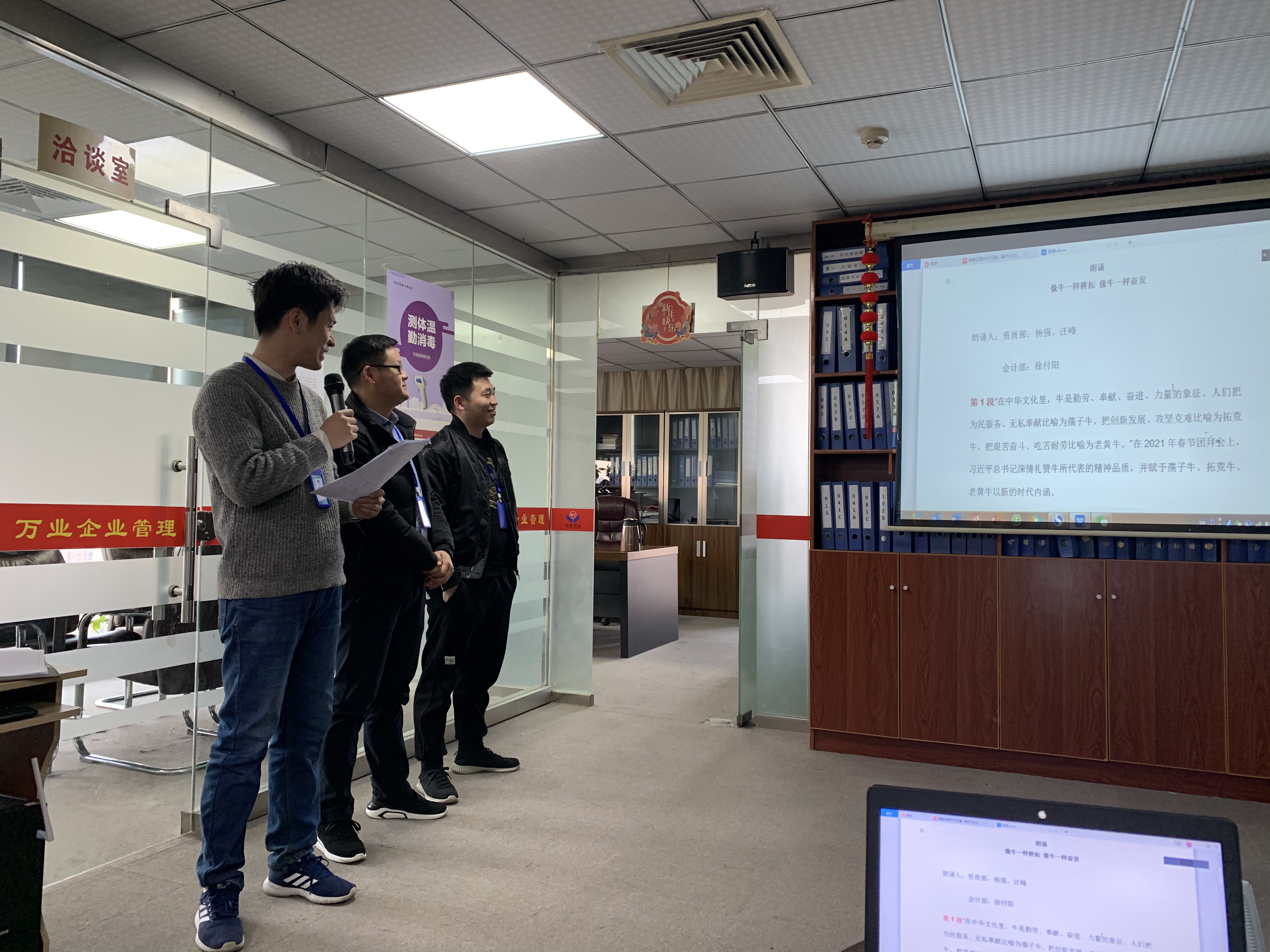 資質(zhì)部——汪峰、楊強,會計部——徐付陽朗誦“像牛一樣耕耘,像牛一樣奮發(fā)”