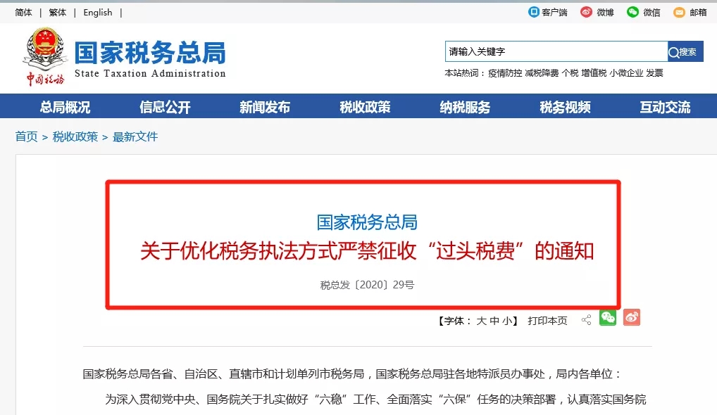 國(guó)家稅務(wù)總局 關(guān)于優(yōu)化稅務(wù)執(zhí)法方式嚴(yán)禁征收“過(guò)頭稅費(fèi)”的通知 稅總發(fā)〔2020〕29號(hào) 國(guó)家稅務(wù)總局各省、自治區(qū)、直轄市和計(jì)劃單列市稅務(wù)局,國(guó)家稅務(wù)總局駐各地特派員辦事處,局內(nèi)各單位: 為深入貫徹黨中央、國(guó)務(wù)院關(guān)于扎實(shí)做好“六穩(wěn)”工作、全面落實(shí)“六保”任務(wù)的決策部署,認(rèn)真落實(shí)國(guó)務(wù)院常務(wù)會(huì)議有關(guān)精神,進(jìn)一步提升政治站位,充分發(fā)揮稅收職能作用,統(tǒng)籌推進(jìn)疫情防控和支持經(jīng)濟(jì)社會(huì)發(fā)展,現(xiàn)就優(yōu)化稅務(wù)執(zhí)法方式、嚴(yán)禁征收“過(guò)頭稅費(fèi)”有關(guān)要求進(jìn)一步強(qiáng)調(diào)如下: 一、堅(jiān)決防止違規(guī)征稅收費(fèi) 各級(jí)稅務(wù)機(jī)關(guān)要進(jìn)一步堅(jiān)持依法規(guī)范組織收入原則不動(dòng)搖,堅(jiān)決壓實(shí)主體責(zé)任,嚴(yán)禁征收“過(guò)頭稅費(fèi)”、違規(guī)攬稅收費(fèi)以及以清繳補(bǔ)繳為名增加市場(chǎng)主體不合理負(fù)擔(dān)。堅(jiān)決不搞大規(guī)模集中清欠、大面積行業(yè)檢查,堅(jiān)決禁止采取空轉(zhuǎn)、轉(zhuǎn)引稅款等手段虛增收入。建立健全稅費(fèi)收入質(zhì)量監(jiān)控和分析機(jī)制,利用大數(shù)據(jù)完善分區(qū)縣、分稅種、分時(shí)段的收入實(shí)時(shí)監(jiān)控體系,對(duì)收入畸高畸低等異常情況,及時(shí)分析排查,發(fā)現(xiàn)違法違規(guī)行為一律嚴(yán)肅處理,并建立典型案例通報(bào)制度,強(qiáng)化以案示警的作用。要積極向地方黨委、政府和相關(guān)部門匯報(bào),進(jìn)一步爭(zhēng)取對(duì)依法依規(guī)組織稅費(fèi)收入的支持,避免采取不當(dāng)?shù)慕M織收入措施。上級(jí)稅務(wù)部門要加強(qiáng)對(duì)下級(jí)稅務(wù)部門組織收入工作的監(jiān)督指導(dǎo),想方設(shè)法幫助其化解征收工作面臨的矛盾和壓力。 二、不斷改進(jìn)稅收風(fēng)險(xiǎn)管理 健全事前事中事后全流程稅收風(fēng)險(xiǎn)管理運(yùn)行機(jī)制,進(jìn)一步完善基于大數(shù)據(jù)的“雙隨機(jī)、一公開”“信用+風(fēng)險(xiǎn)”監(jiān)管方式,切實(shí)增強(qiáng)稅收風(fēng)險(xiǎn)管理的針對(duì)性和有效性,既有效防范和打擊偷騙稅行為,又盡最大可能不影響企業(yè)正常生產(chǎn)經(jīng)營(yíng)。統(tǒng)籌發(fā)揮好稅收風(fēng)險(xiǎn)管理服務(wù)自主遵從和規(guī)范稅收秩序的功能,以服務(wù)為導(dǎo)向,強(qiáng)化事前精準(zhǔn)提示提醒,不得組織對(duì)某一行業(yè)開展多年期、撒網(wǎng)式的風(fēng)險(xiǎn)推送和自查補(bǔ)繳稅費(fèi),重視和保障納稅人、繳費(fèi)人對(duì)推送風(fēng)險(xiǎn)的自訴權(quán)益,促進(jìn)其及時(shí)補(bǔ)正、精準(zhǔn)糾錯(cuò),避免違法違規(guī)風(fēng)險(xiǎn);以規(guī)范為目的,強(qiáng)化事中精準(zhǔn)控制、事后精準(zhǔn)應(yīng)對(duì),嚴(yán)厲精準(zhǔn)打擊“假企業(yè)”“假出口”“假申報(bào)”等涉稅違法行為,防止稅收流失,維護(hù)國(guó)家稅收安全。 三、積極支持新業(yè)態(tài)健康發(fā)展 主動(dòng)適應(yīng)新經(jīng)濟(jì)不斷發(fā)展的新要求,持續(xù)完善支持電子商務(wù)、“互聯(lián)網(wǎng)+”等新興業(yè)態(tài)發(fā)展的稅收政策體系和管理服務(wù)措施,大力培育新興經(jīng)濟(jì)增長(zhǎng)點(diǎn)。繼續(xù)堅(jiān)持包容審慎的原則,不得專門針對(duì)某一新興業(yè)態(tài)、新型商業(yè)模式,組織開展全面風(fēng)險(xiǎn)應(yīng)對(duì)和稅務(wù)檢查。積極運(yùn)用稅收大數(shù)據(jù),深入分析線上經(jīng)濟(jì)發(fā)展情況,完善精準(zhǔn)化、精細(xì)化稅收服務(wù)和管理措施,促進(jìn)線上線下融合,支持新興業(yè)態(tài)持續(xù)健康發(fā)展。 四、不折不扣落實(shí)稅費(fèi)優(yōu)惠政策 進(jìn)一步落實(shí)落細(xì)黨中央、國(guó)務(wù)院出臺(tái)的系列稅費(fèi)優(yōu)惠政策,不斷鞏固和拓展政策實(shí)施成效。結(jié)合疫情防控,動(dòng)態(tài)更新《支持疫情防控和經(jīng)濟(jì)社會(huì)發(fā)展稅費(fèi)優(yōu)惠政策指引》,及時(shí)通過(guò)“云課堂”、線上答疑等方式,回應(yīng)稅收熱點(diǎn)問(wèn)題,深入開展針對(duì)性政策解讀和輔導(dǎo),助力納稅人、繳費(fèi)人應(yīng)享盡享。適時(shí)開展減稅降費(fèi)督查,狠抓發(fā)現(xiàn)問(wèn)題整改,強(qiáng)化跟蹤問(wèn)效,暢通政策落實(shí)“最后一公里”,確保減稅降費(fèi)政策紅利直達(dá)困難企業(yè)、直達(dá)市場(chǎng)主體。 五、持續(xù)優(yōu)化辦稅繳費(fèi)服務(wù) 大力鞏固拓展“非接觸式”辦稅繳費(fèi)服務(wù),進(jìn)一步擴(kuò)大網(wǎng)上辦稅繳費(fèi)事項(xiàng)范圍,確保主要辦稅繳費(fèi)事項(xiàng)均能網(wǎng)上辦理。簡(jiǎn)化優(yōu)化稅費(fèi)申報(bào)手續(xù),加快推進(jìn)增值稅、消費(fèi)稅、城市維護(hù)建設(shè)稅主附稅合并申報(bào)和財(cái)產(chǎn)行為稅一體化納稅申報(bào)。繼續(xù)深化與銀保監(jiān)部門和銀行業(yè)金融機(jī)構(gòu)的合作,搭建“稅銀互動(dòng)”信息共享平臺(tái),擴(kuò)大受益范圍,增進(jì